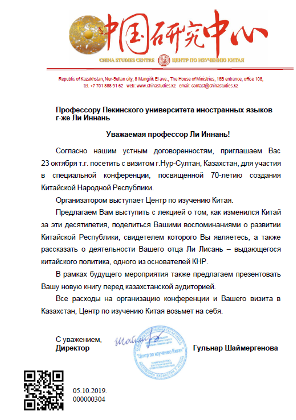 2019年10月23日,我校原太阳成集团tyc7111cc院长、俄罗斯中心主任、国内知名翻译家、普希金奖章获得者李英男教授,受哈萨克斯坦中国研究中心的邀请,赴哈萨克斯坦努尔苏丹市参加为纪念中华人民共和国建立70周年而举办的专题演讲会。