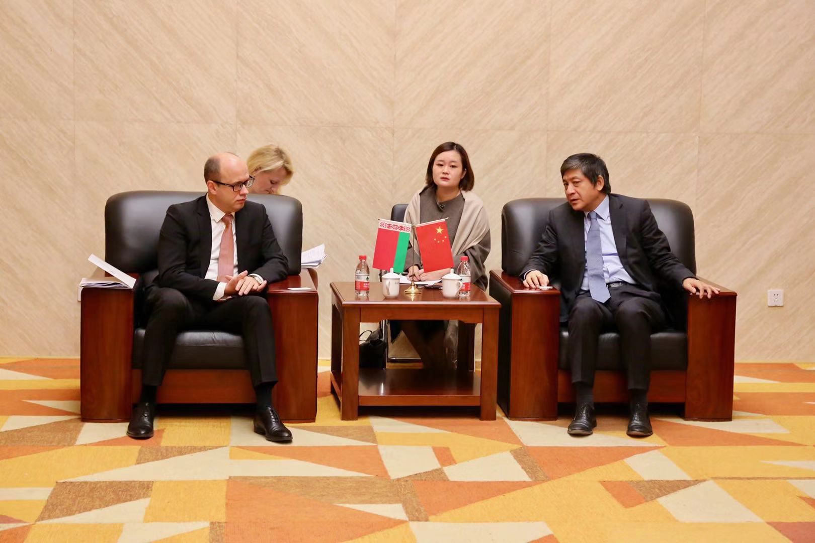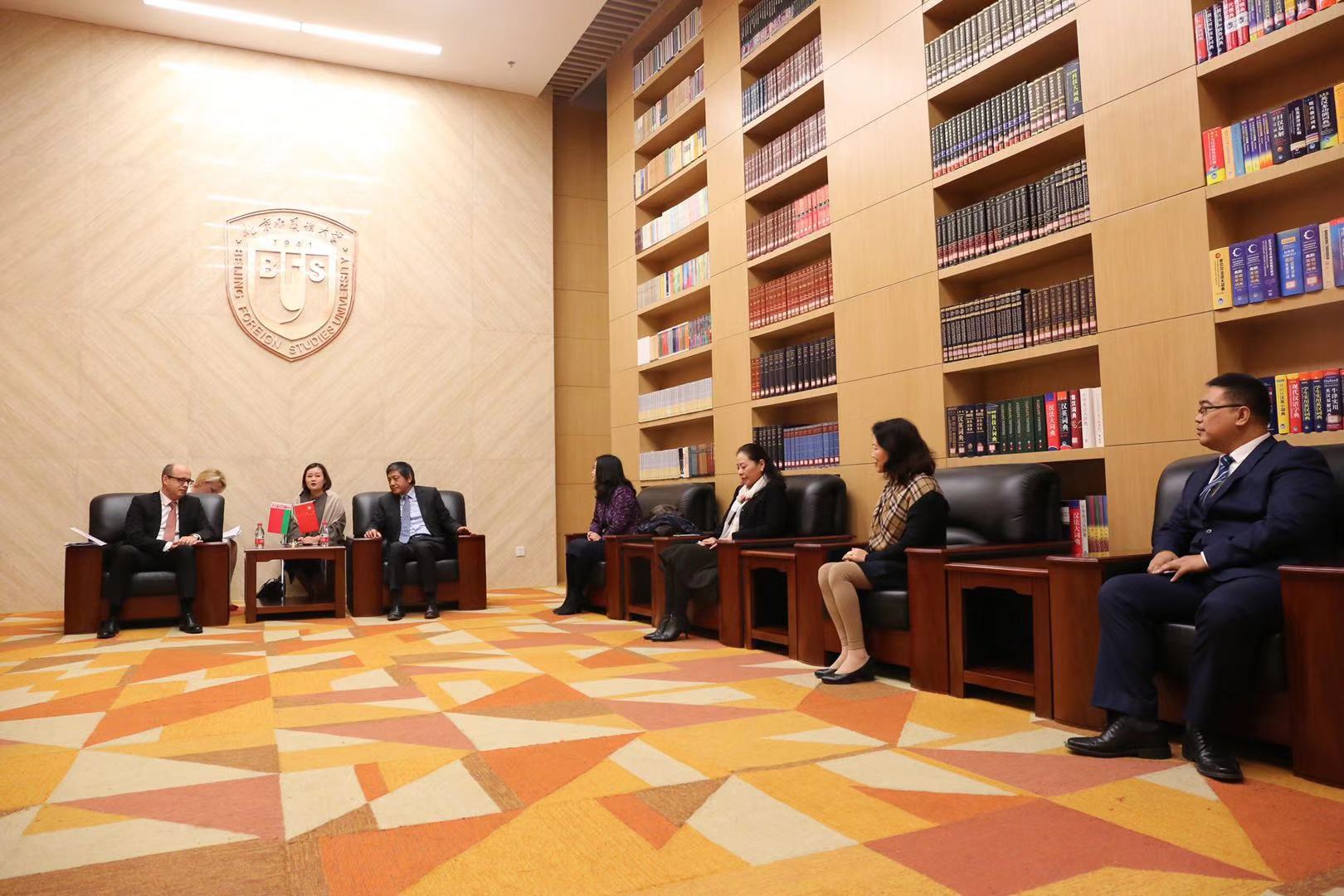 双方在图书馆五层贵宾室进行了会谈。彭龙校长首先向鲁德大使一行的到来表示欢迎,并向白俄罗斯客人介绍了北外的总体情况。彭龙校长表示,北外教授的98种语言中,也包括白俄罗斯语。目前已经开设了白俄罗斯语作为第三外语的课程,明年将正式招收本科学生,培养白俄语和俄语复语人才。鲁德大使表示,北外作为中国外语教学的领航者,在白俄罗斯享有盛誉,白俄罗斯的大学非常希望开展与北外之间的合作。白俄罗斯驻华使馆将为北外的白俄语教学提供一切必要的帮助。在鲁德大使和彭龙校长的共同意愿下,计划2018年年底—2019年年初在北外共建白俄中心。双方还就学生和教师交流、学术研究、合作出版、特别是联合培养和联合办学等可合作领域进行了亲切商谈。